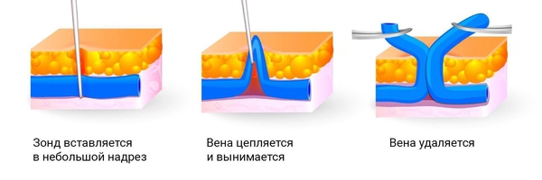 Далее с помощью специальной иглы врач делает проколы на коже в месте расположения варикозных узлов, которые были отмечены ранее. Отделяют вену от тканей с помощью хирургических крючков, а затем выводят ее наружу через прокол.