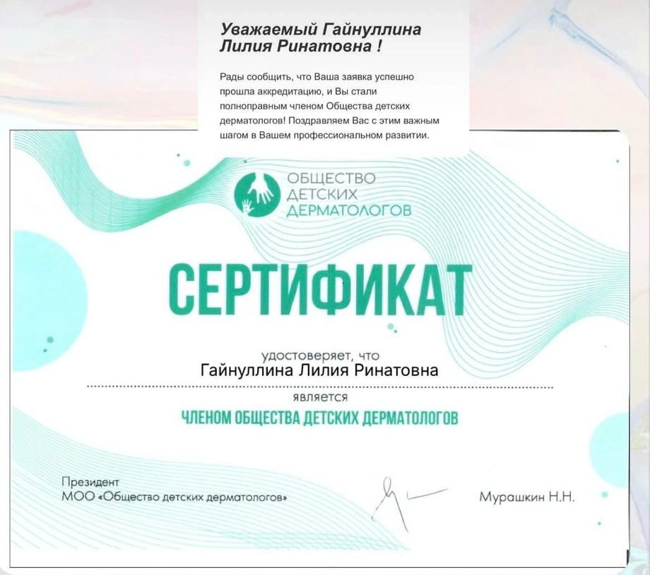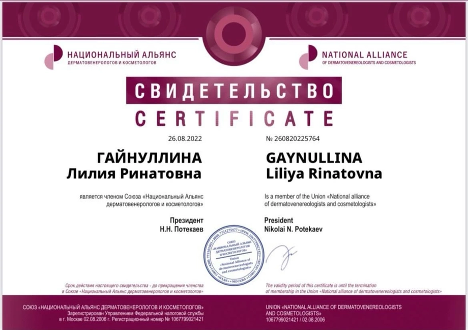 Лилия Ринатовна является членом Союза "Национальный Альянс дерматовенерологов и косметологов", членом Общества детских дерматологов, а также членом Российского общества дерматовенерологов и косметологов.