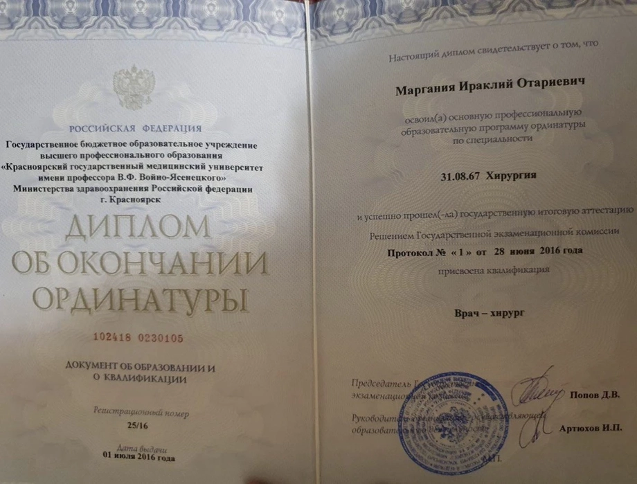 2016 г. – Красноярский государственный медицинский университет, Ординатура по специальности «Хирургия»