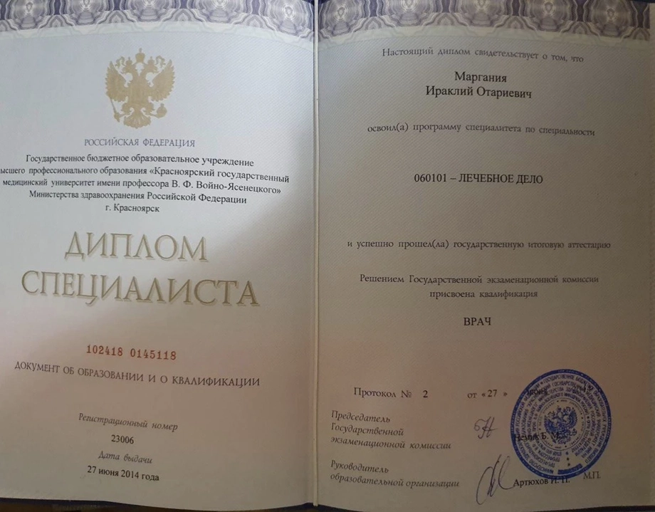 2014 г. – Красноярский государственный медицинский университет, ВУЗ по специальности «Лечебное дело»